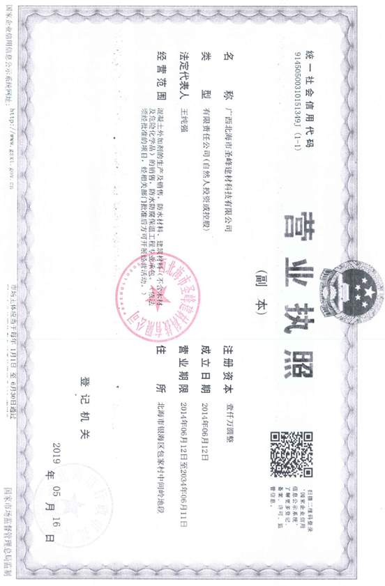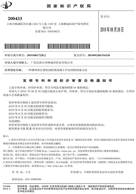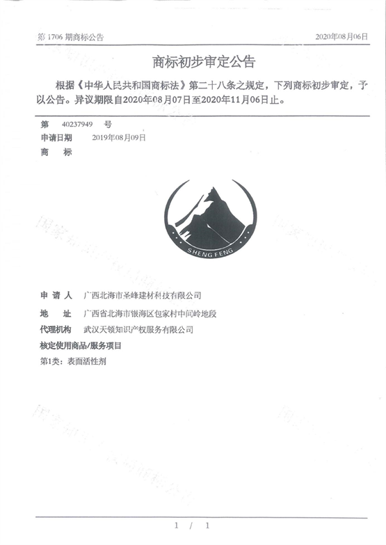 广西北海市圣峰建材科技有限公司前身是广西大新建材化工总厂,是一家创新型环保建材企业。公司是国内最早研制和生产防水材料的生产企业,拥有行业内最先进的技术和设备,得到武汉理工大学行业内著名专家技术支持,建立了高标准的科技研发中心和实验室,在广西大新建材化工总厂研发的科技成果及30多年实际应用基础上,持续改进,研发出新一代抗裂抗渗混凝土结构自防水外加剂:SF-1高性能综合型抗裂抗渗混凝土外加剂,已获得国家发明专利专利号:2019108172282;SF-3高分子型抗裂抗渗砂浆改性剂,已获得国家发明专利,专利号:201911396577.8。