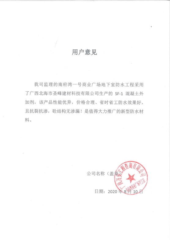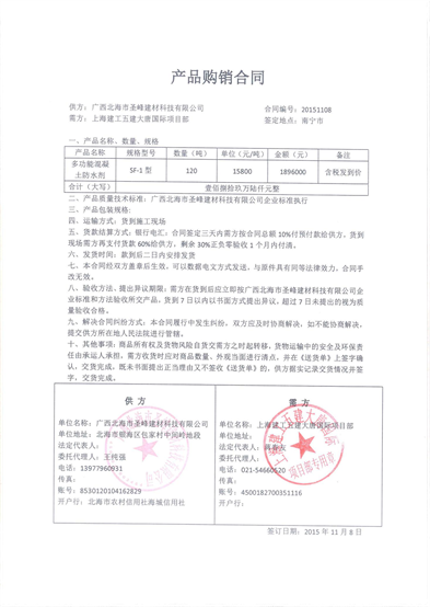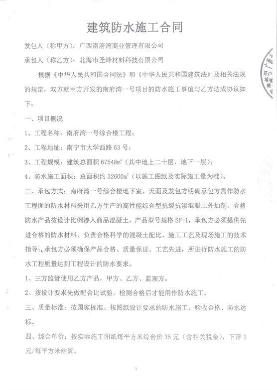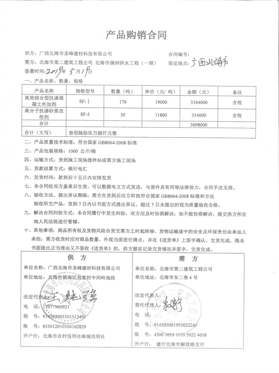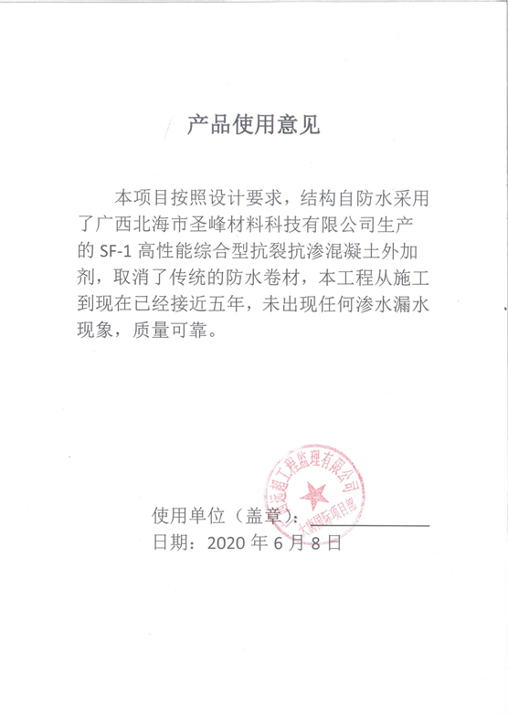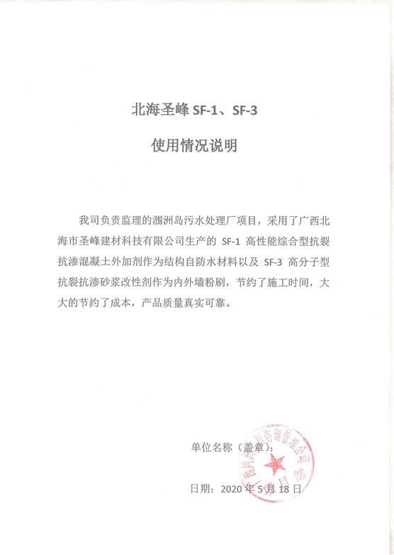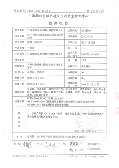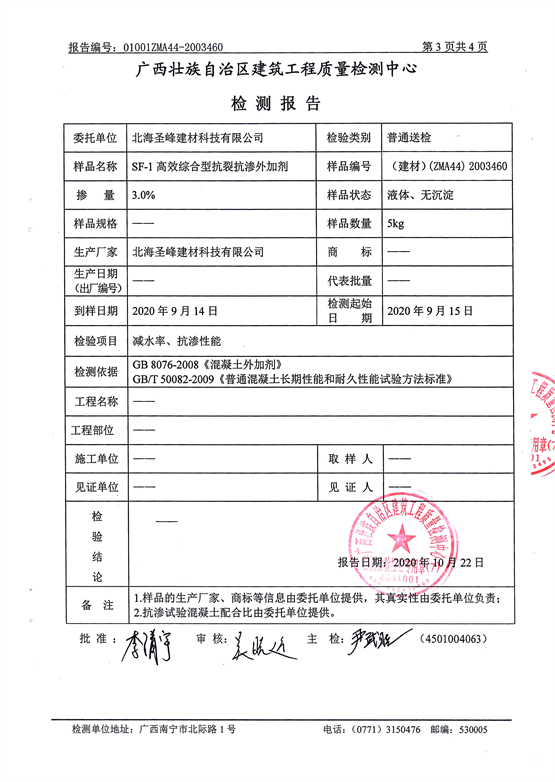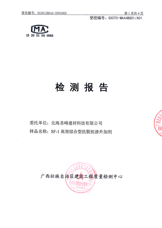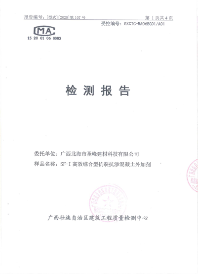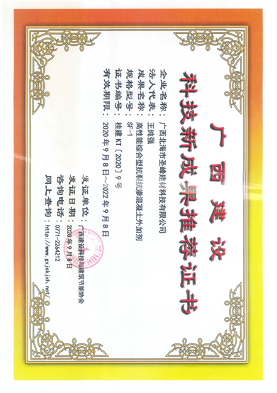 经广西建设厅专家组织鉴定,北海市圣峰建材科技有限公司生产的SF-1高性能综合型抗裂抗渗混凝土外加剂,SF-3高分子型抗裂抗渗砂浆改性剂,符合广西壮族自治区工程建设地方标准,DBJ/T45-036-2017的标准要求。