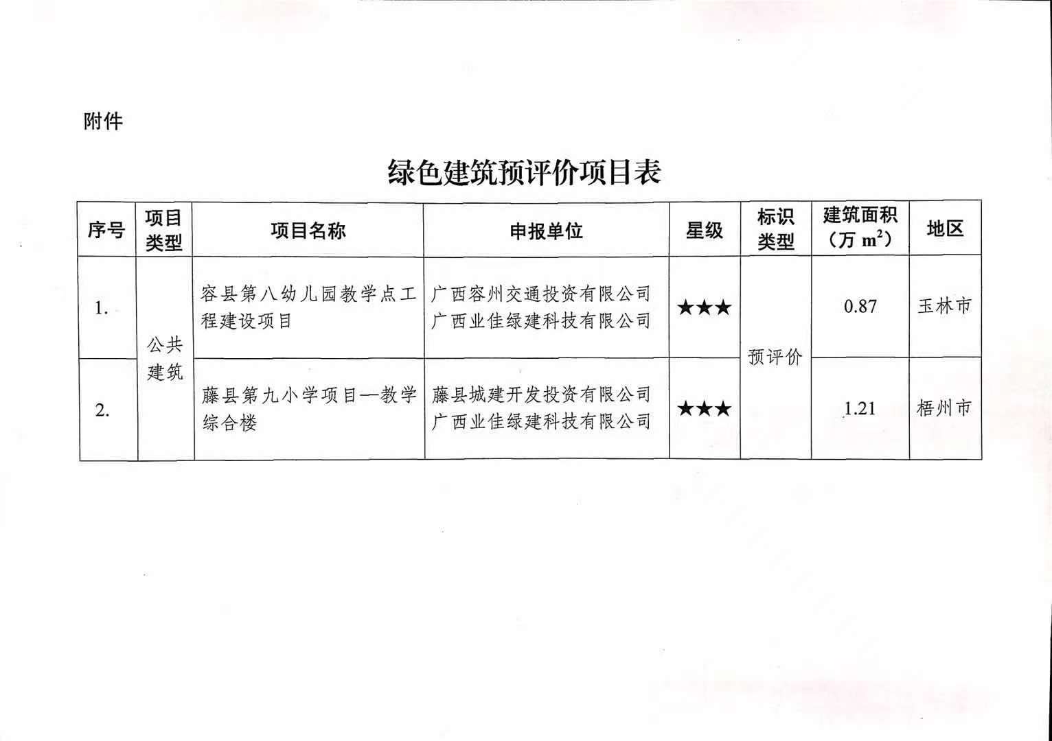 关于容县第八幼儿园教学点工程建设项目和藤县第九小学项目教学综合楼绿色建筑预评价的公示